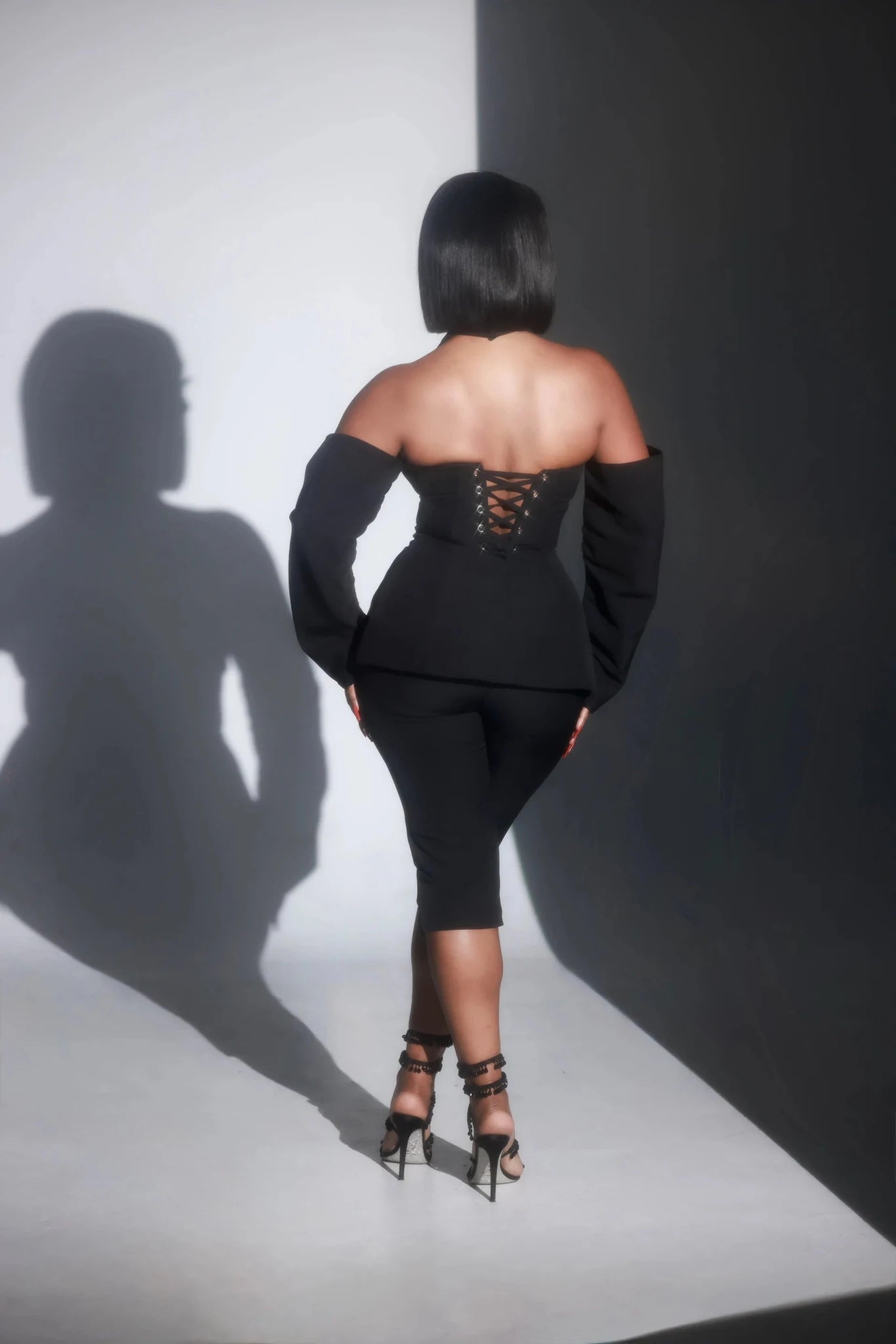 Meet the comeback with a twist. The Blair Black Sleeved Capri Set takes everything you loved about the original the sculpting fit, the structured boning, the head-turning silhouette and makes it even sleeker.