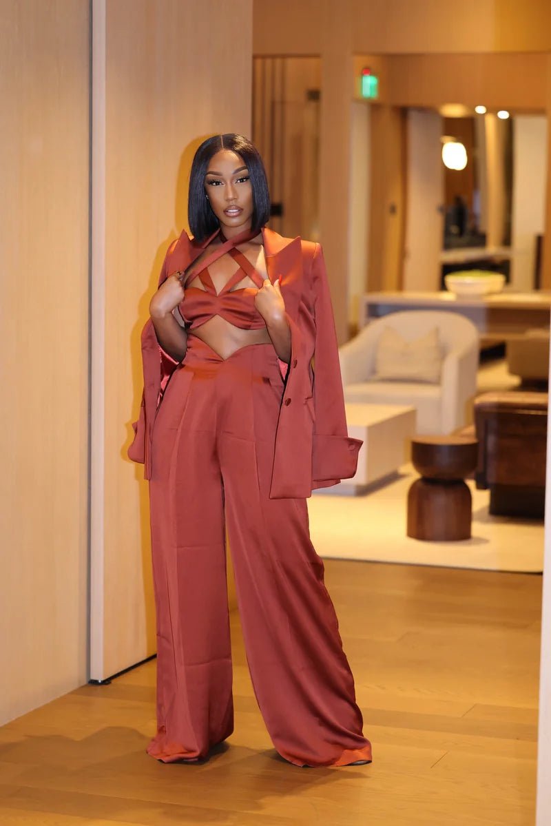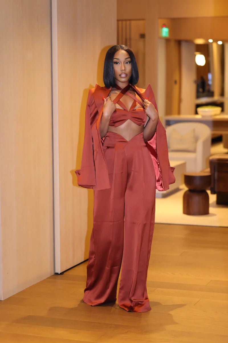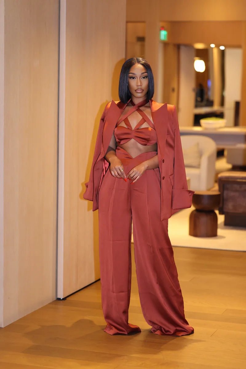 Turn heads in the Nora Copper Satin Bralette Top, your new power-play base layer. Designed with a daring strappy halter neckline and sculpted bust detail, this piece moves like confidence—sleek, bold, and made to stand out. The lustrous copper satin catches every light, adding a touch of drama under a blazer or on its own for nights that mean business.