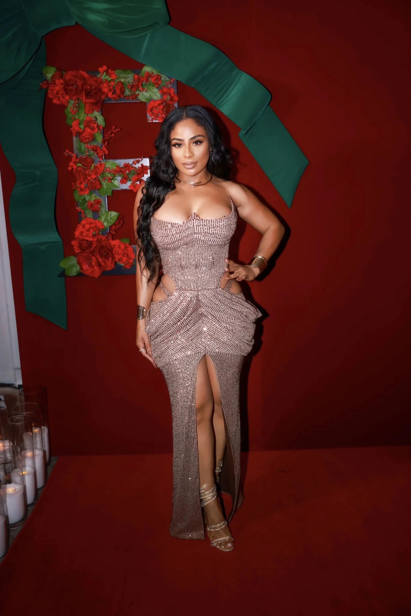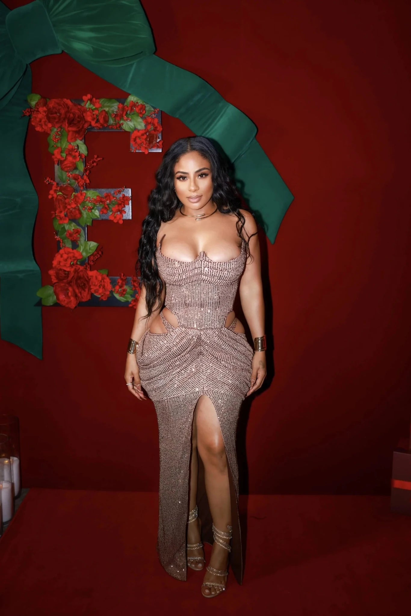 The gown’s signature detail—its dramatic side and back cutouts—highlights the waist and lower back for a sensual, hourglass illusion. Luxe, ruched draping cascades around the hips, creating sculptural volume and liquid movement with every step.